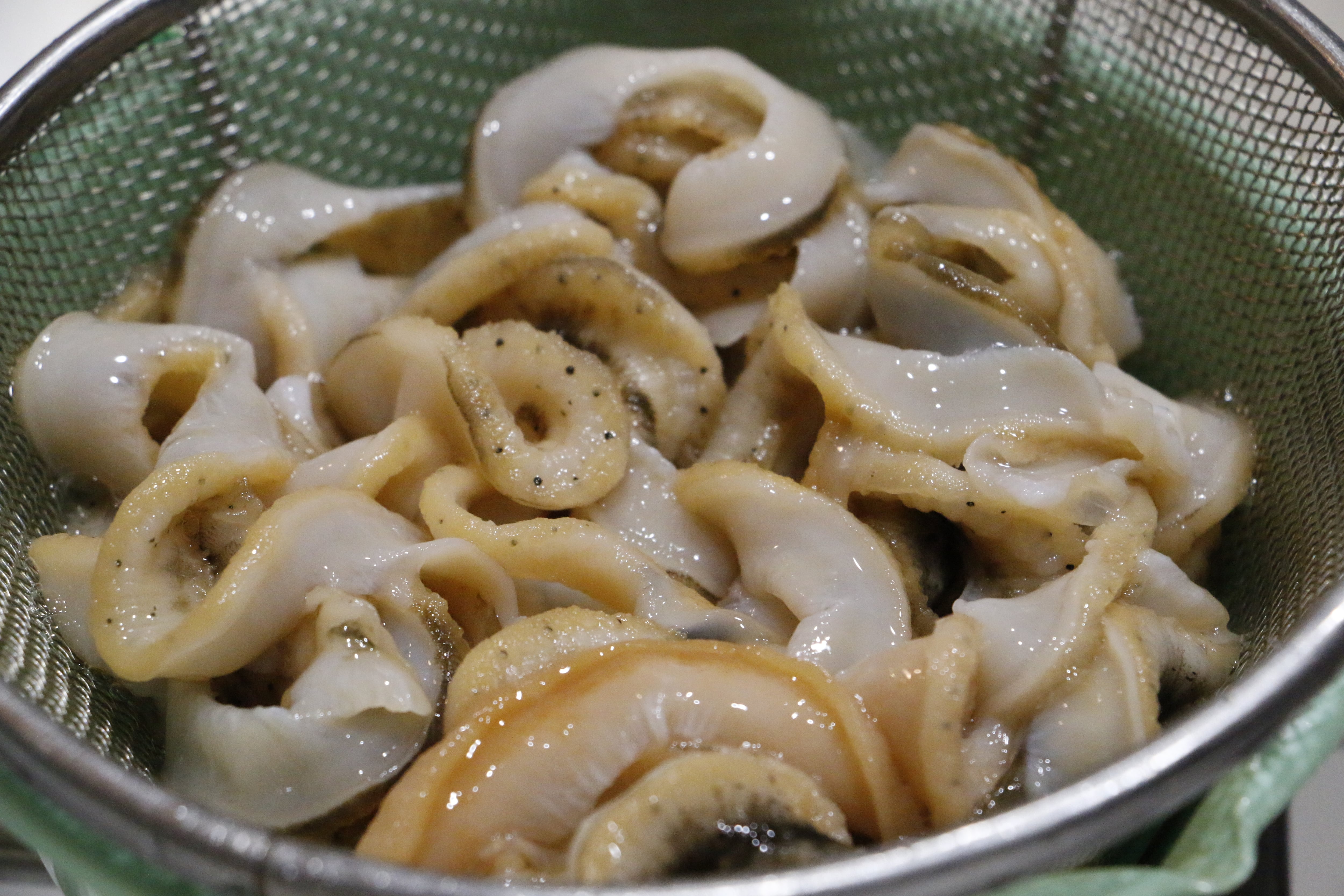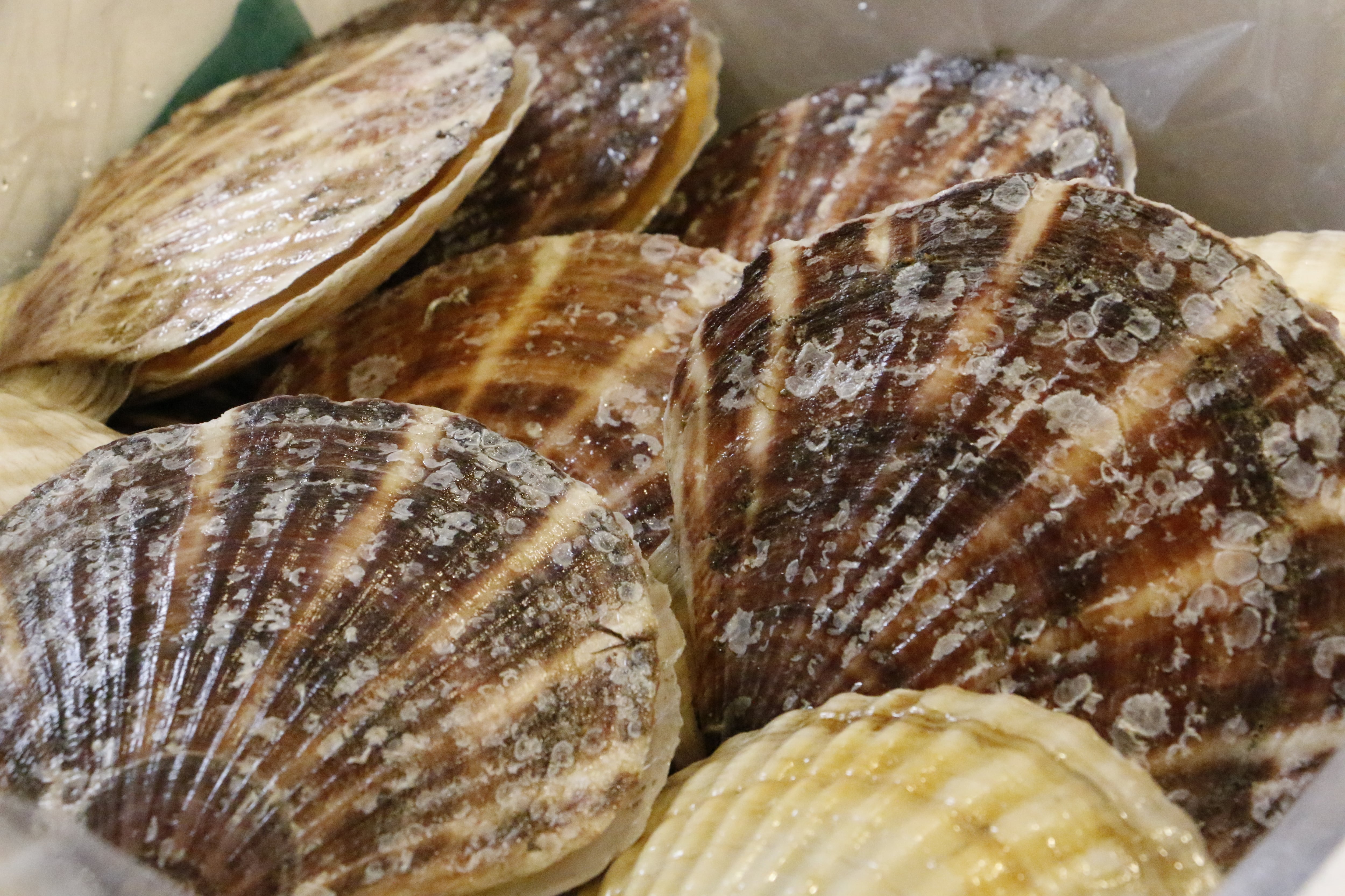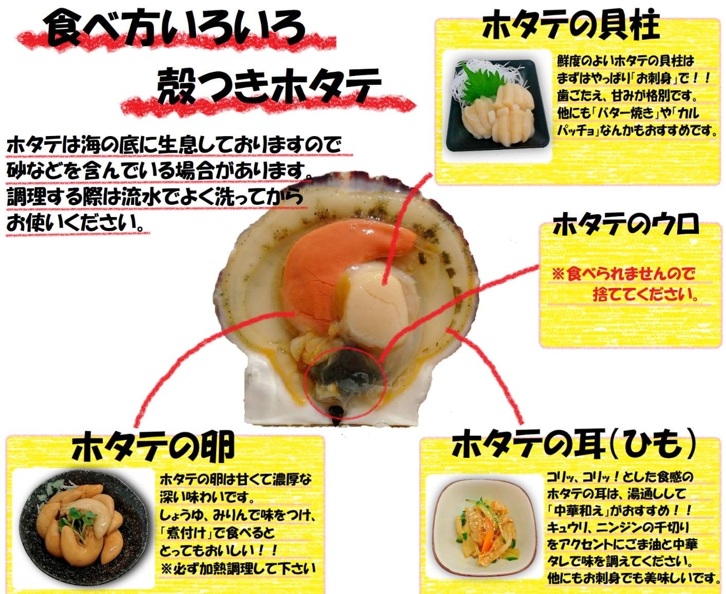 到着後は殻を外し、ウロ(貝の根本の黒い部分)をとり、流水でよく洗ってからお召しあがりください。