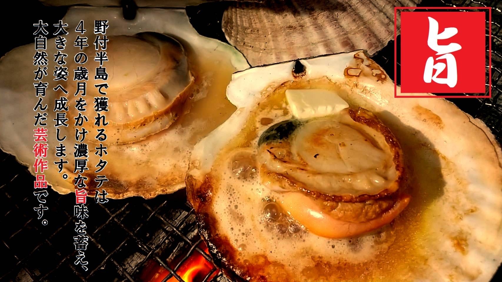 北海道野付産のホタテは野付半島沖の潮の流れが早く、餌となるプランクトンが豊富な海域で4年間大切に育ててます。