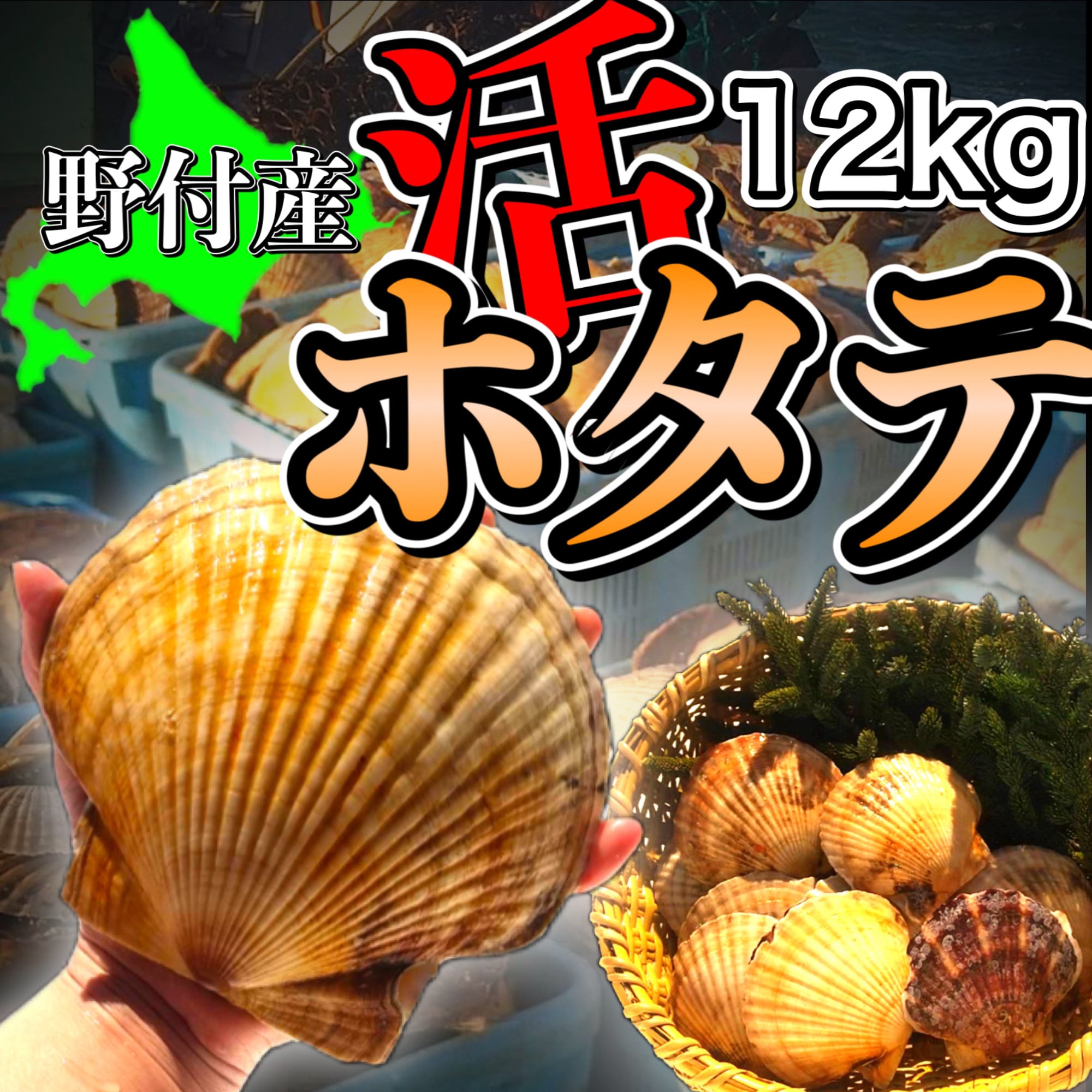 商品名:北海道野付産の特大活ホタテ 12kg詰め(36〜48枚入り)