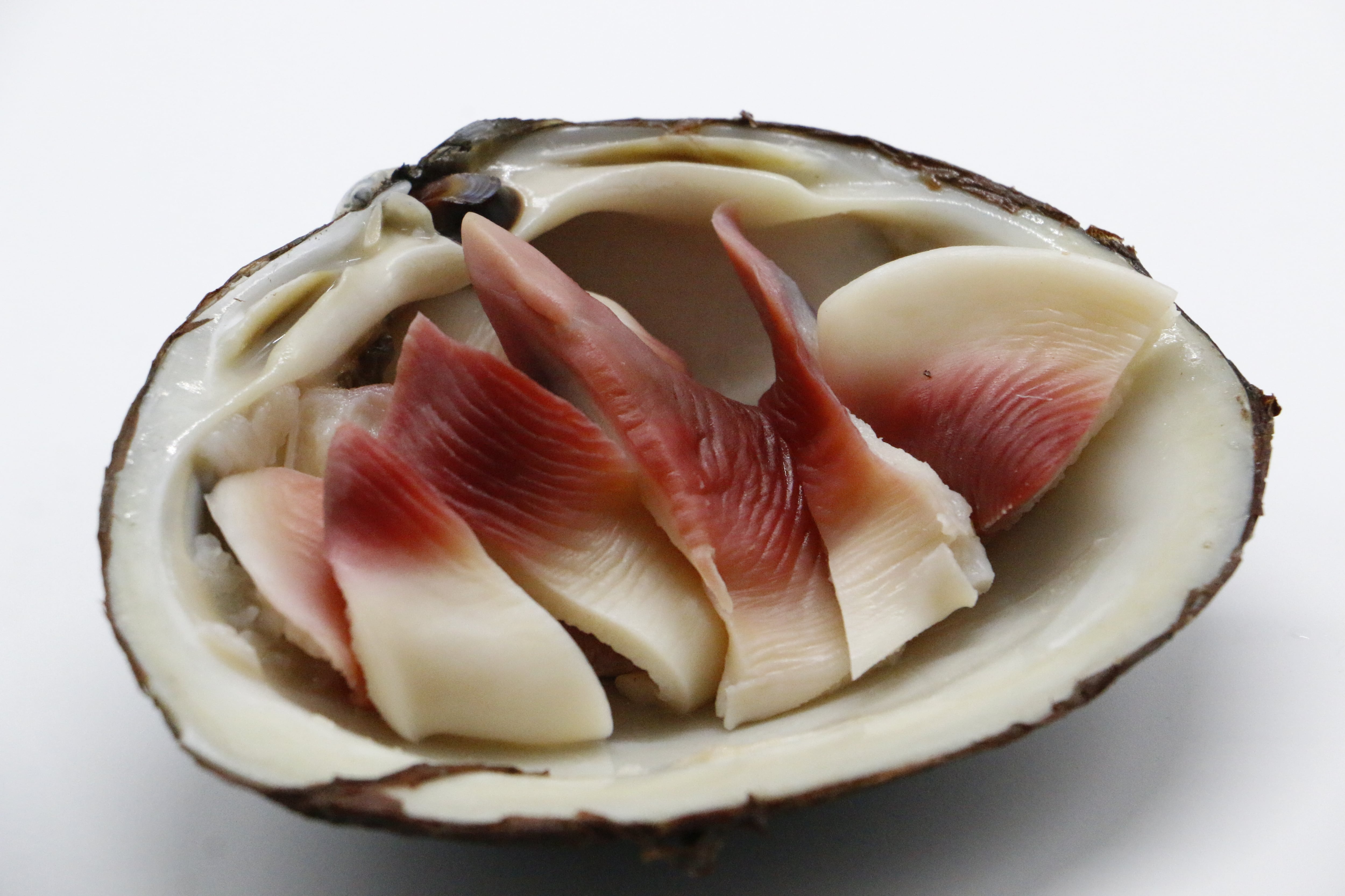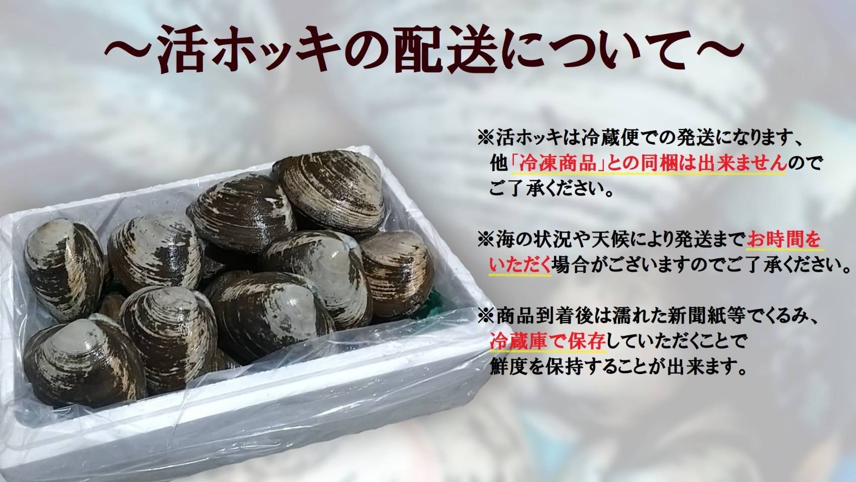到着後は殻を外しウロ(身の中の黒い部分)と水管を取り除き、流水でよく洗ってからお召しあがりください。