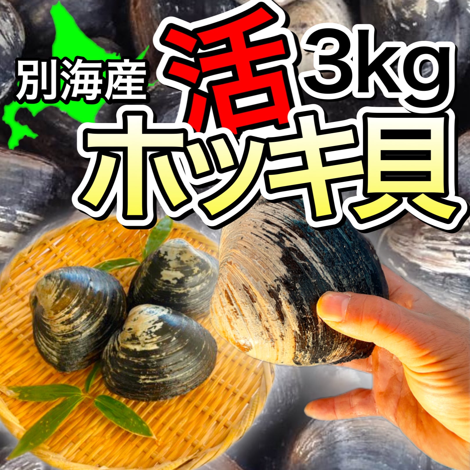 商品名:北海道別海産の活ホッキ 3kg詰め(9~12個入り)